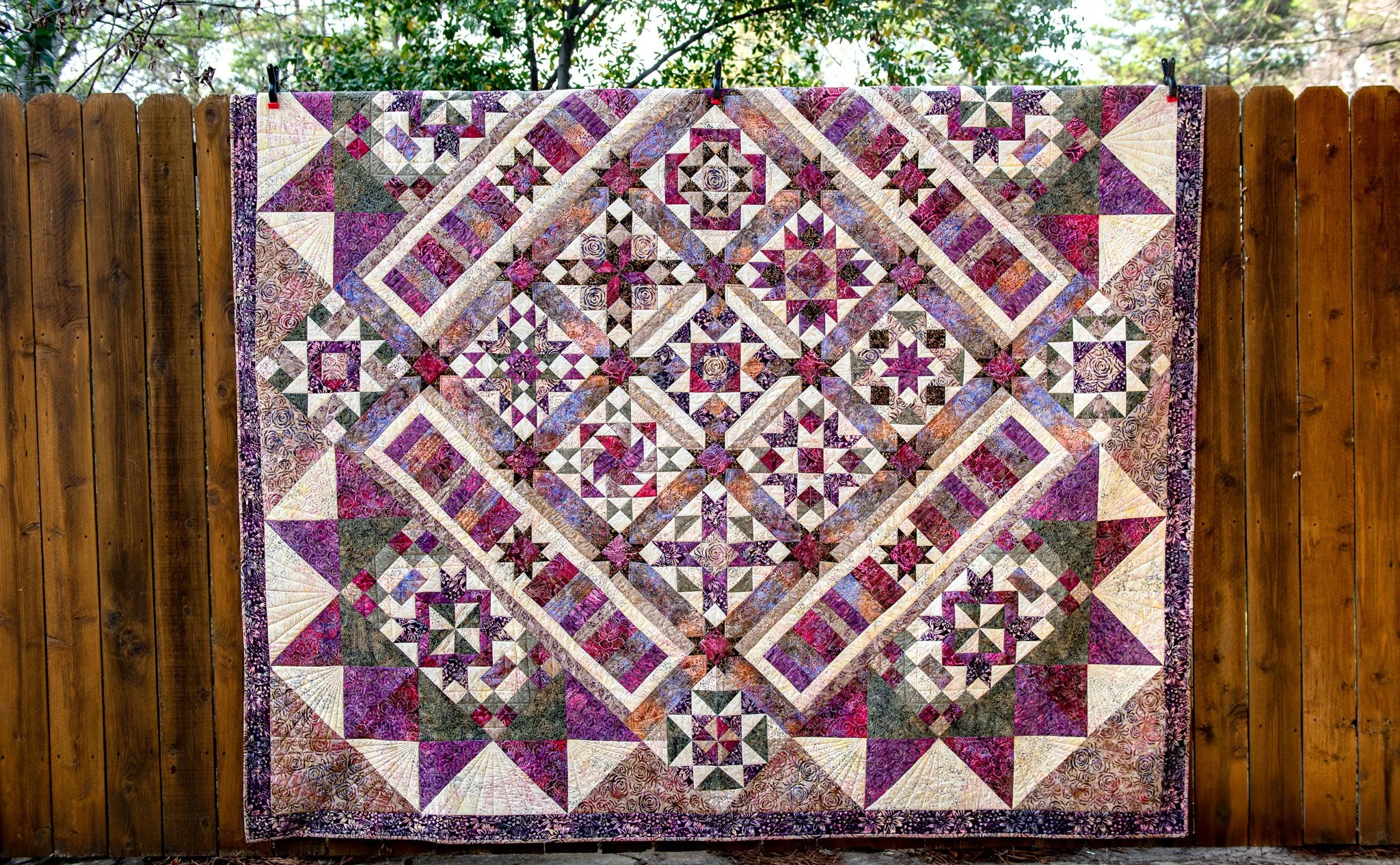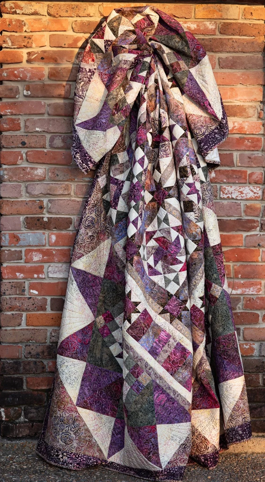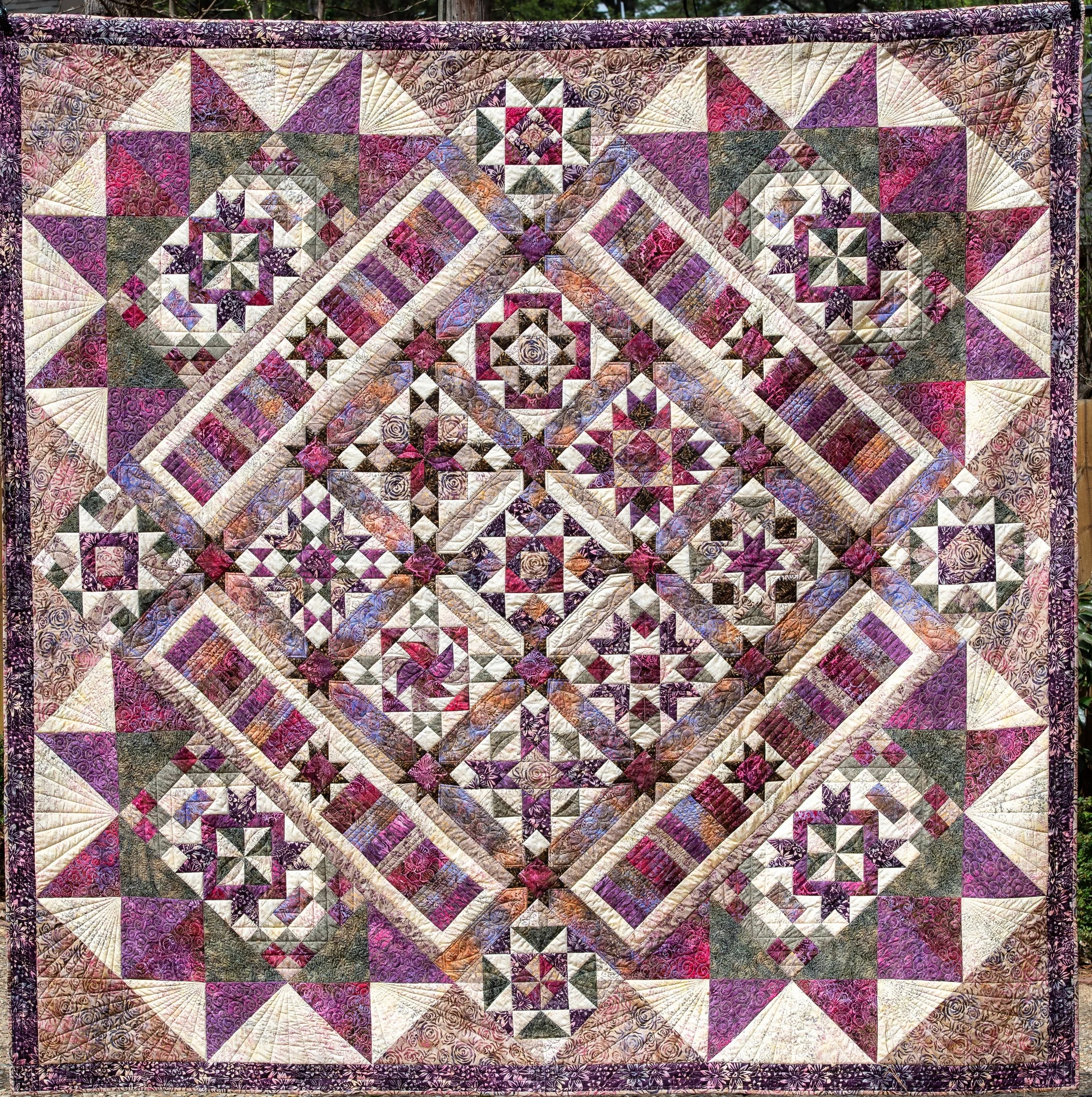 The quilt is composed of twelve monthly blocks sashed with star accent corners. The on-point setting is finished off with large 12" hour glasses that create large corner star points. You can pickup or purchase raffle tickets at our RRQ guild meetings from May to September & at our Quilt Show in September.