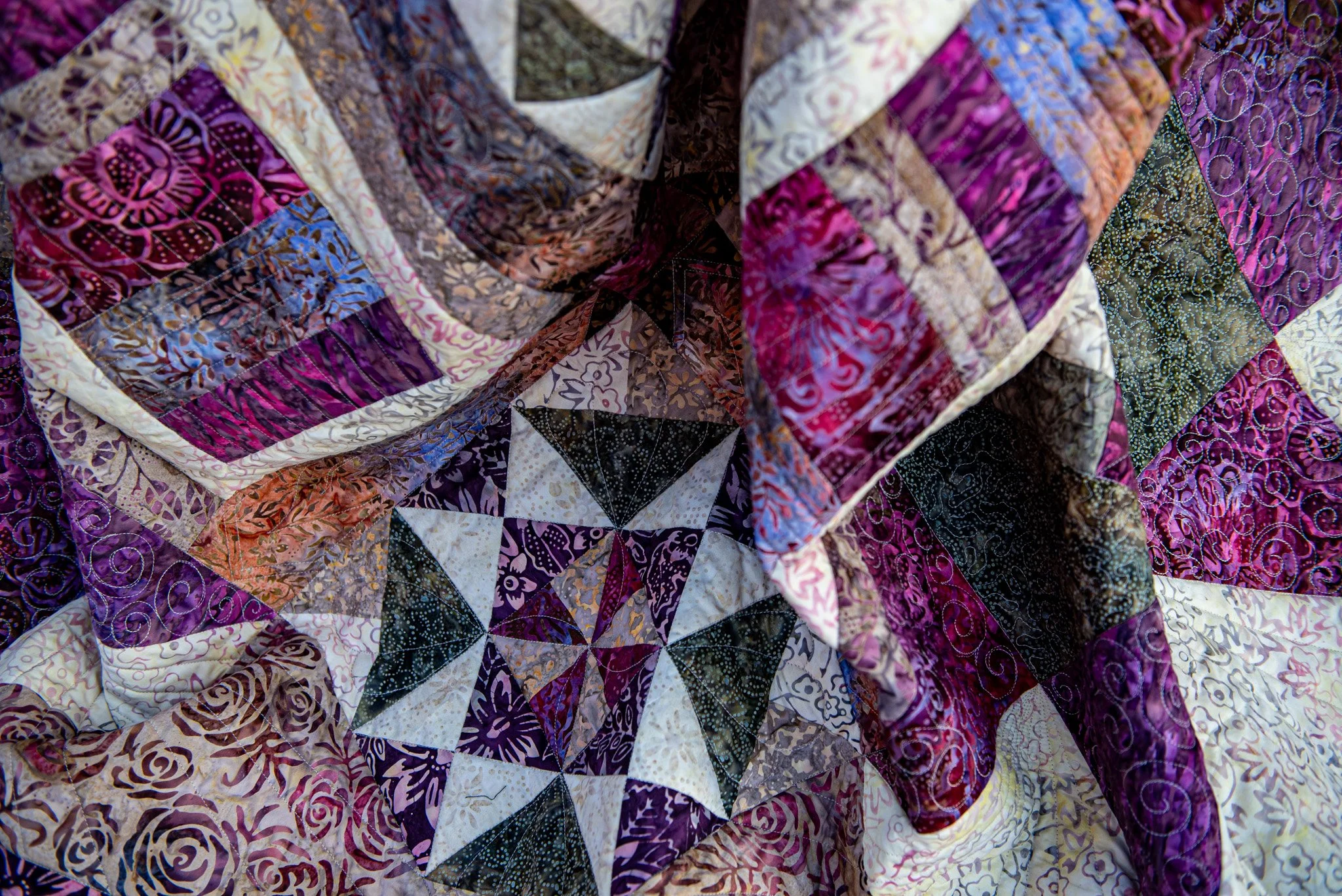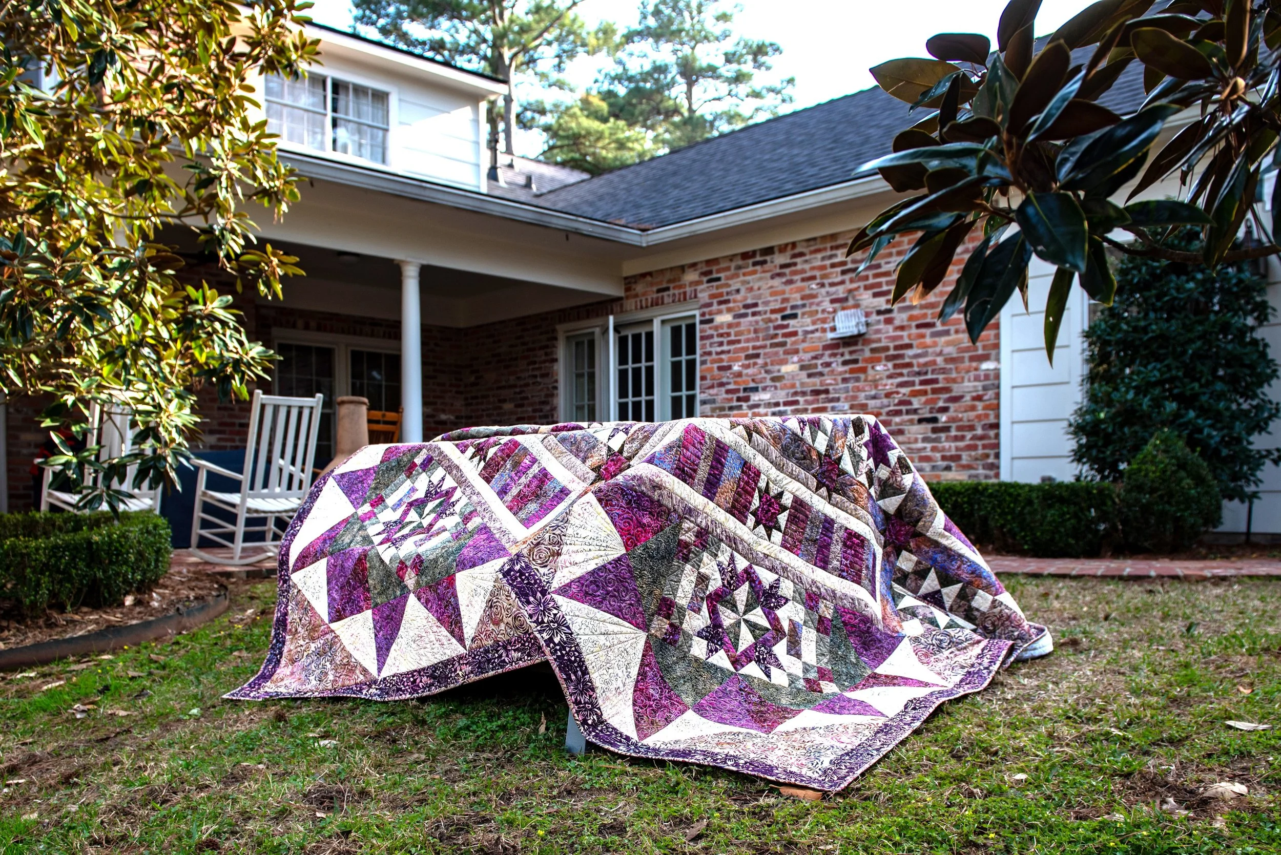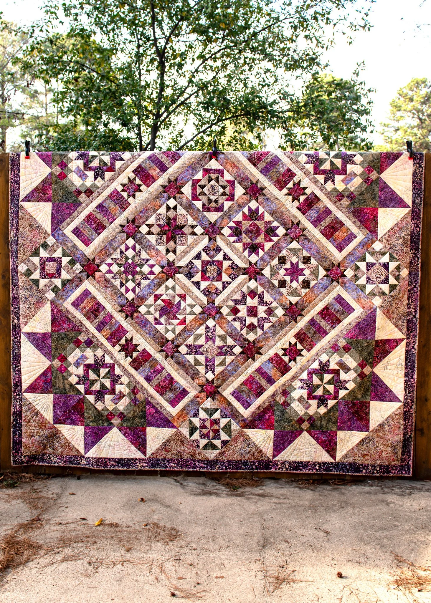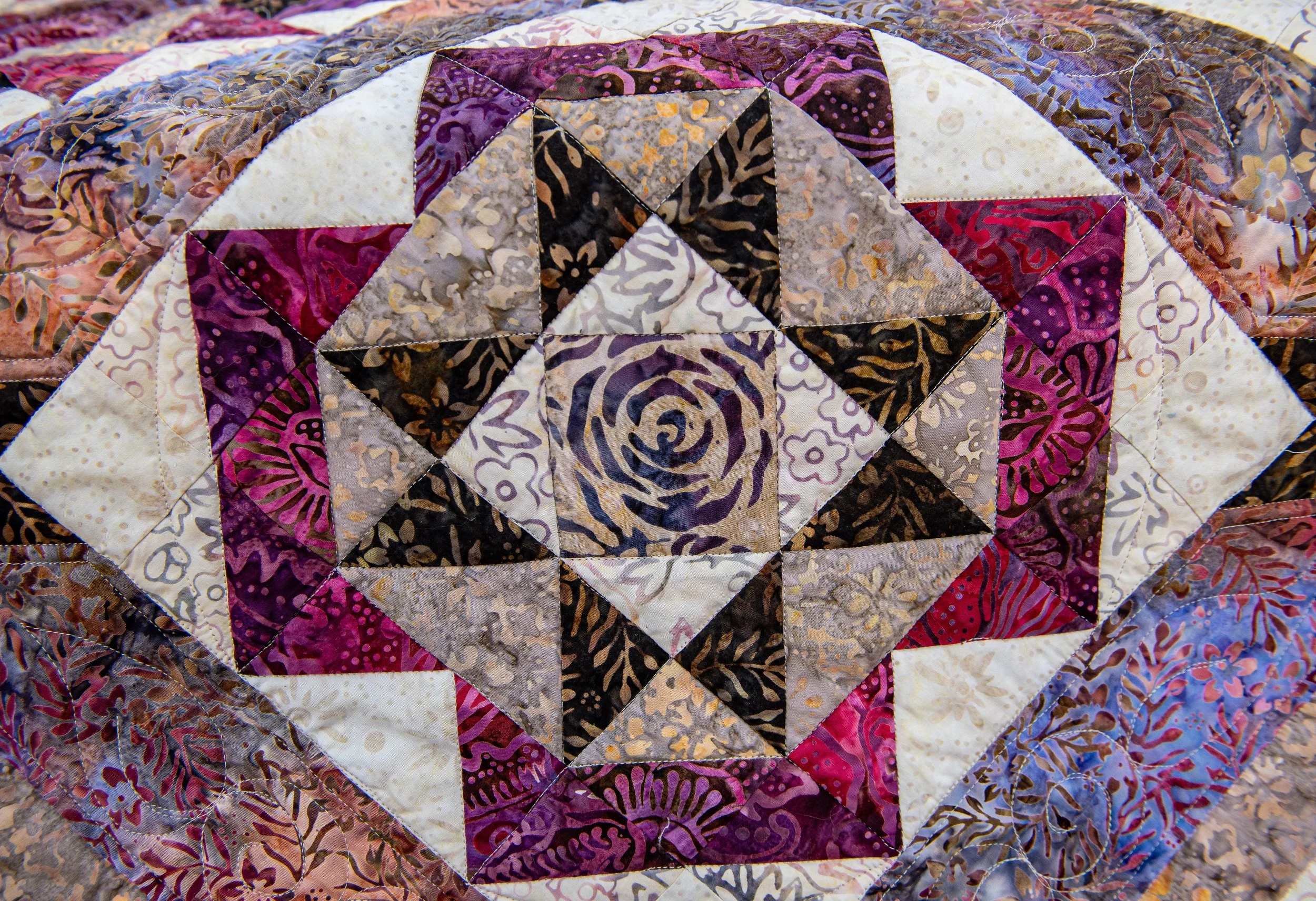 The quilt is composed of twelve monthly blocks sashed with star accent corners. The on-point setting is finished off with large 12" hour glasses that create large corner star points. You can pickup or purchase raffle tickets at our RRQ guild meetings from May to September & at our Quilt Show in September.