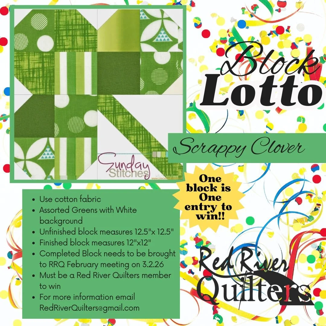 Every month Red River Quilters guild holds a block lotto. Members stitch up a quilt block with the same pattern & color scheme & then everyone that participated has the chance to win all the created blocks at our monthly guild meeting.